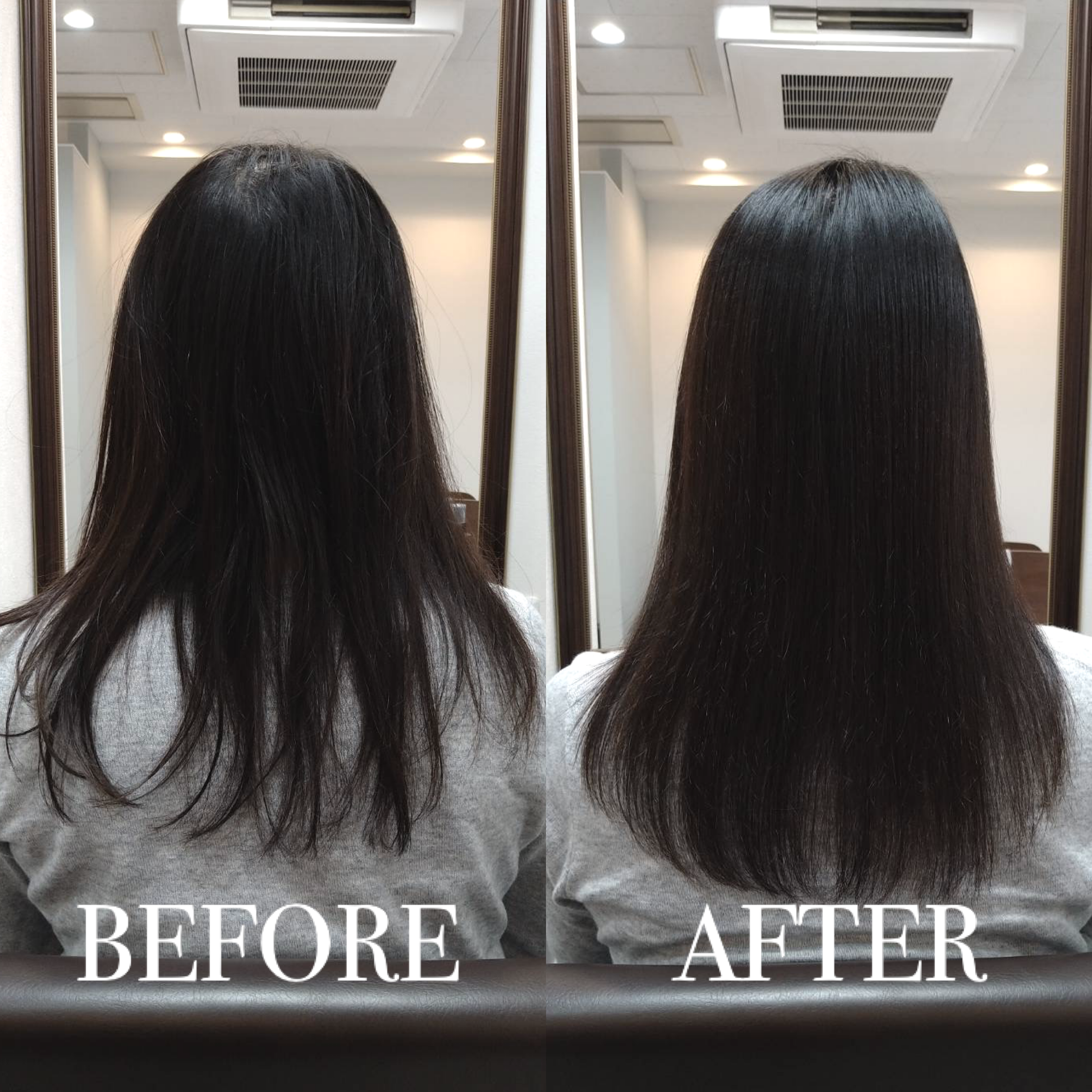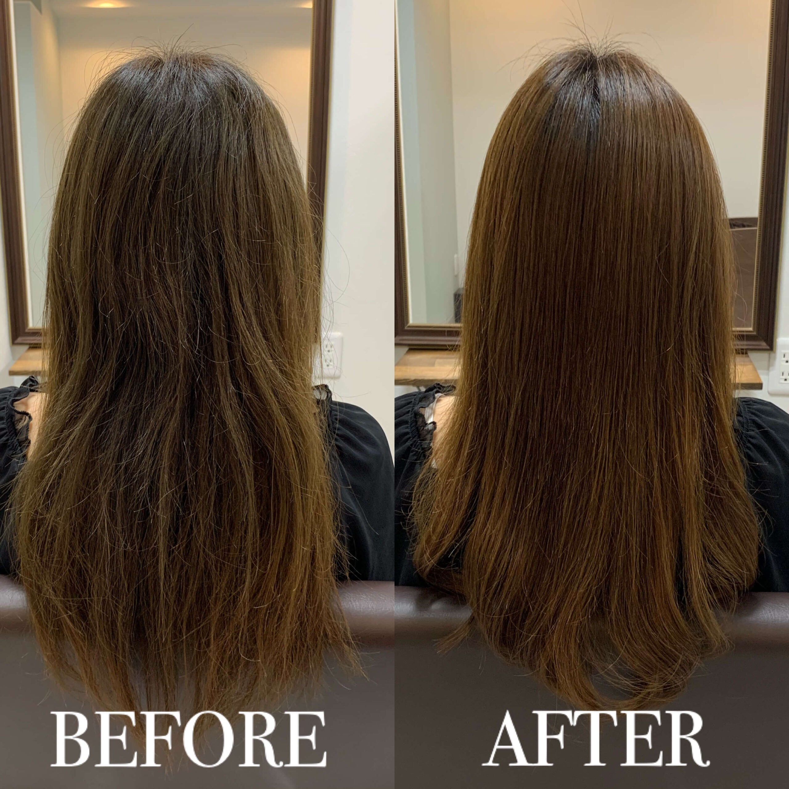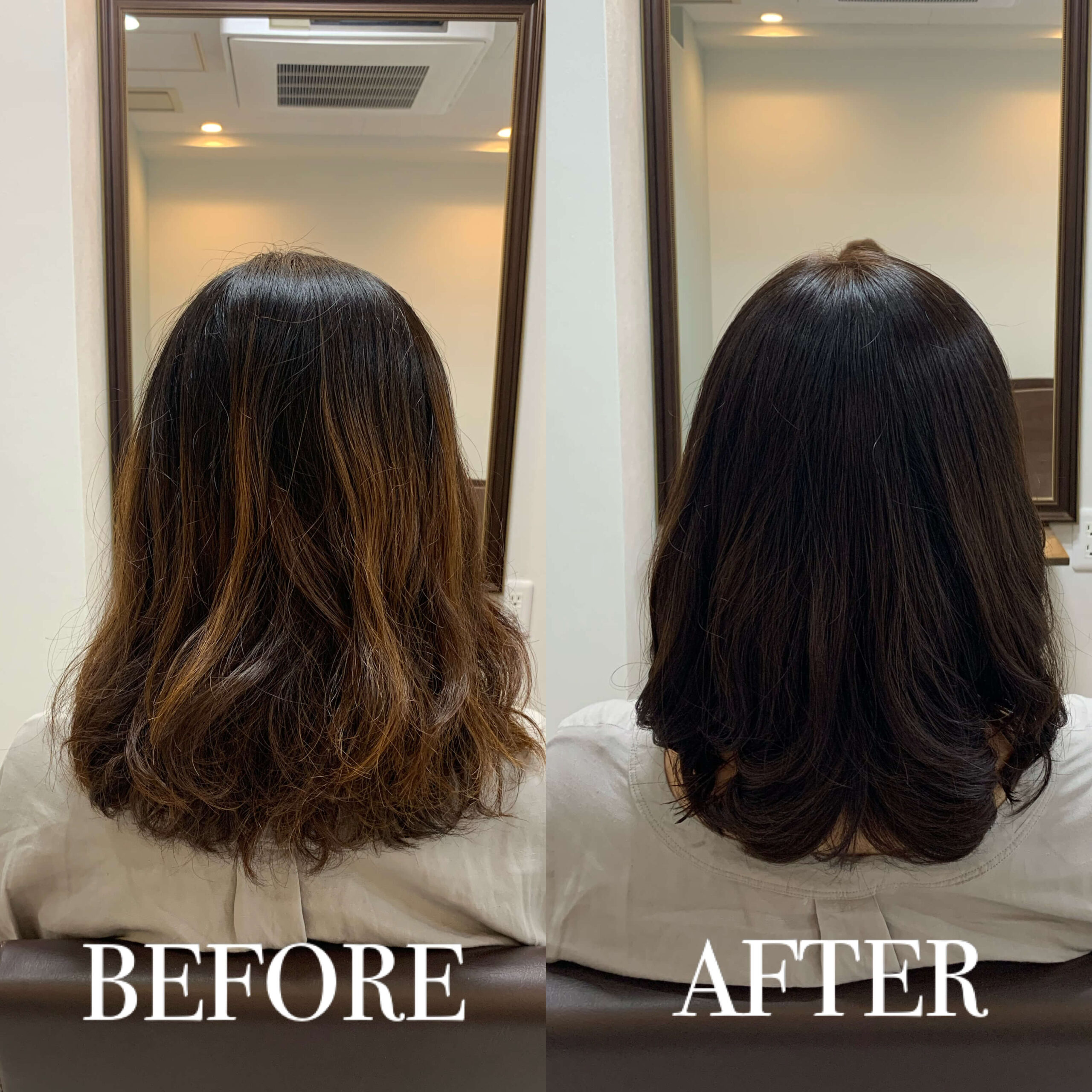 施術では髪の質感を薬剤でコントロールすることをメインに、髪本来のキレイさを色素&栄養を配合し調整しました。